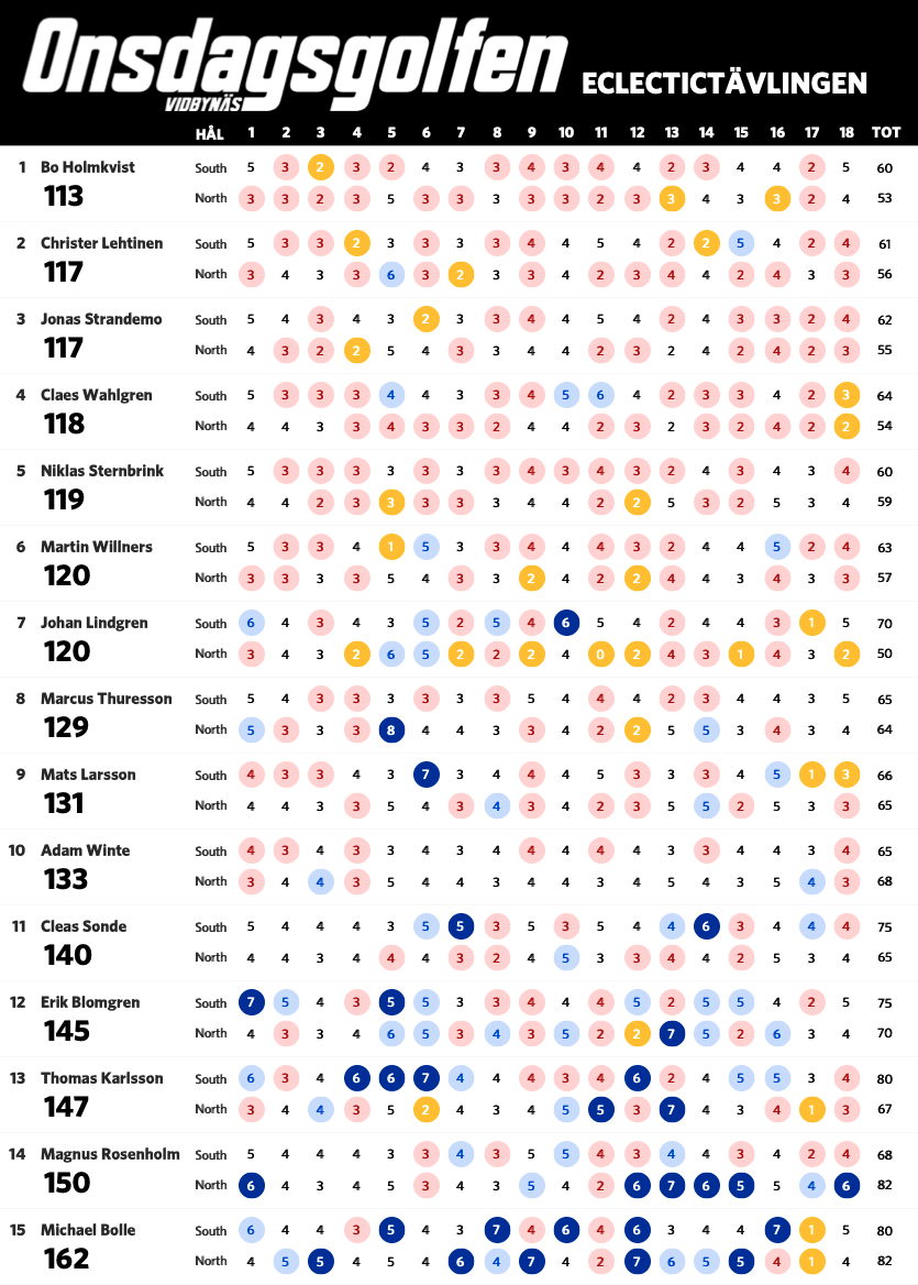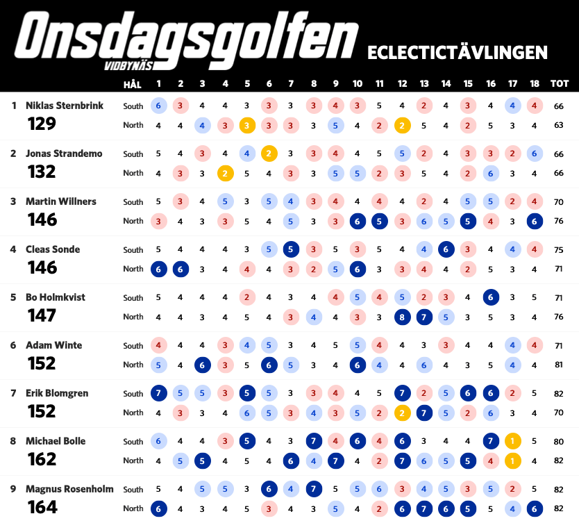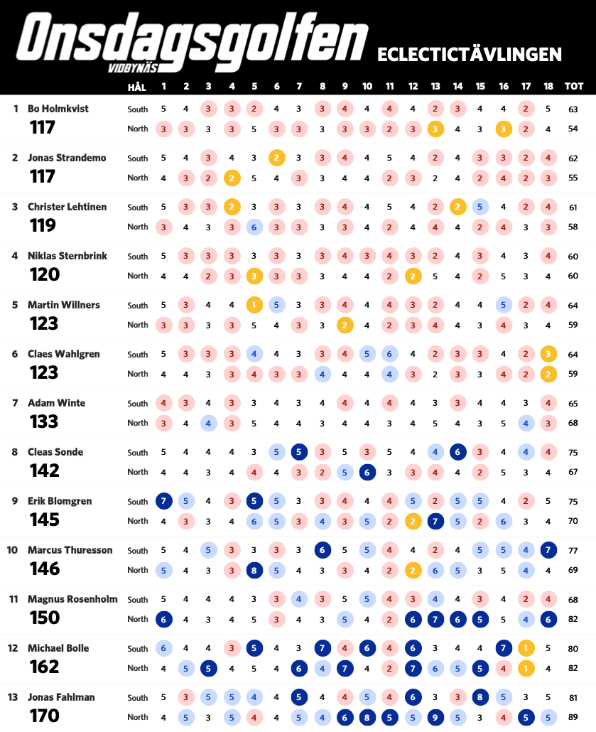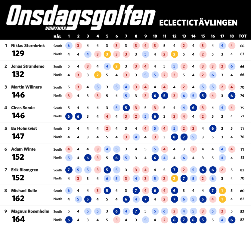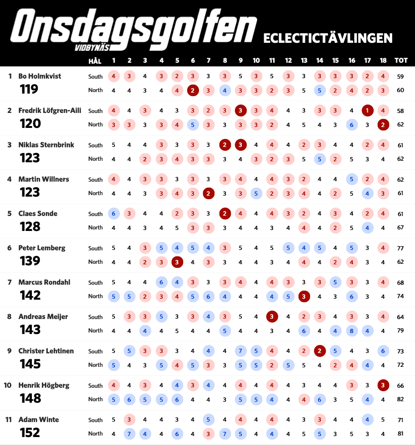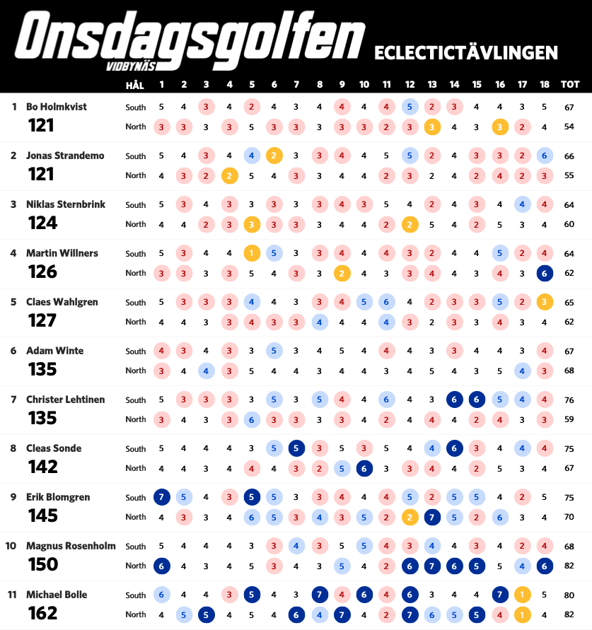 Nu när vi har spelat sju omgångar är det dags för en uppdaterad ställning i eclectic-tävlingen. Bosse har nu tagit sig ner under 60 slag på South och leder tävlingen fem slag för Claes. Nedan ser ni ställning med alla som har spelat både South och North på Onsdagsgolfen i år. Alla röda siffror är nettobirdies, alla mörkröda är nettoeagles och alla blåa är sådant vi vill förbättra nästa runda.