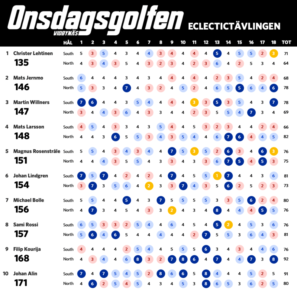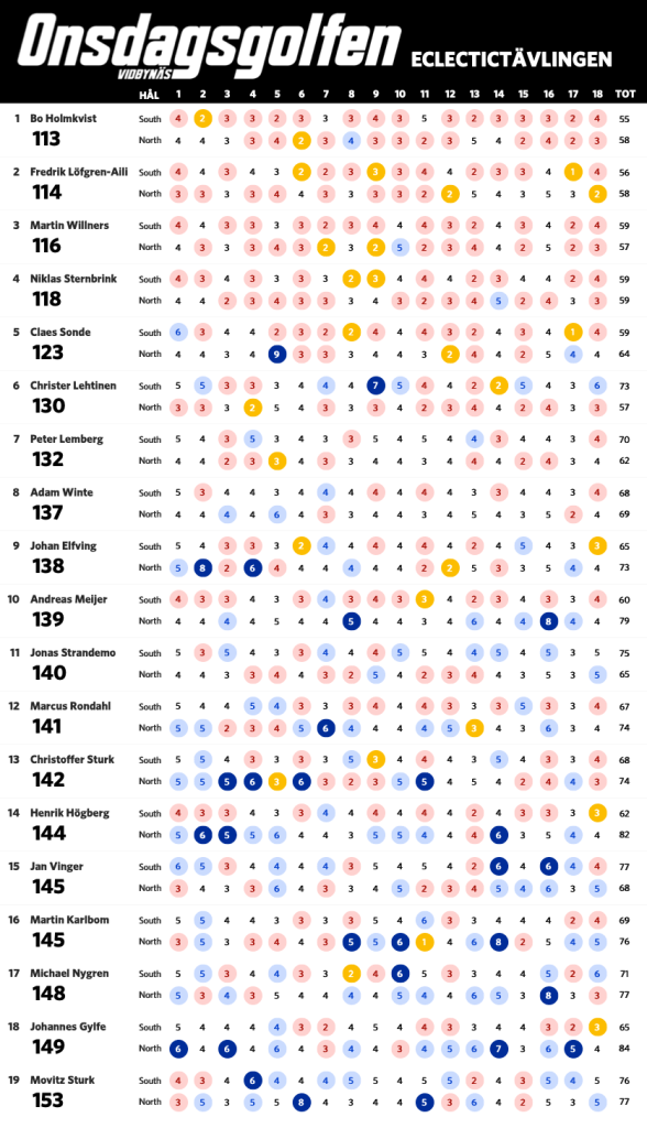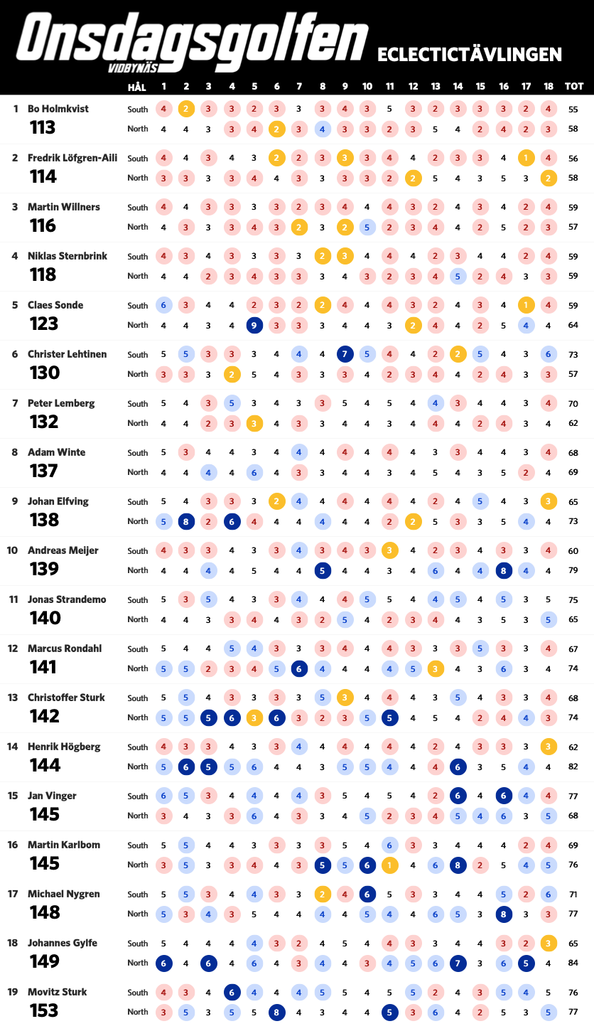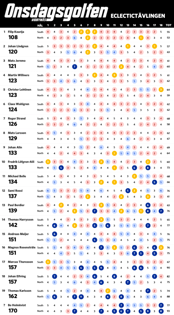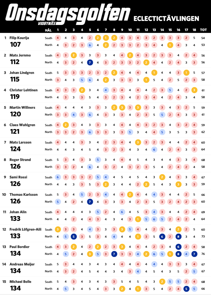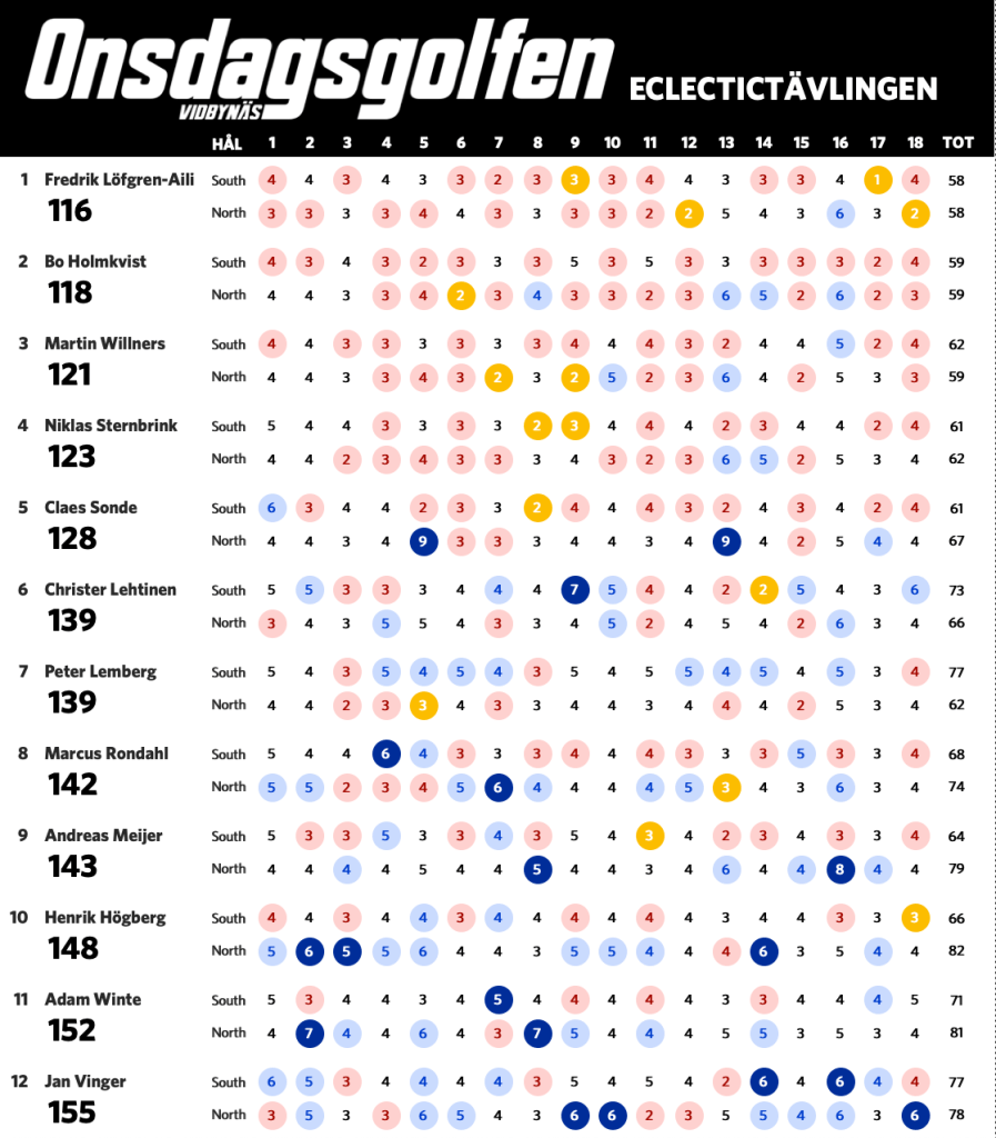 Nu när vi har spelat sju omgångar är det dags för en uppdaterad ställning i eclectic-tävlingen. Bosse har nu tagit sig ner under 60 slag på South och leder tävlingen fem slag för Claes. Nedan ser ni ställning med alla som har spelat både South och North på Onsdagsgolfen i år. Alla röda siffror är nettobirdies, alla mörkröda är nettoeagles och alla blåa är sådant vi vill förbättra nästa runda.