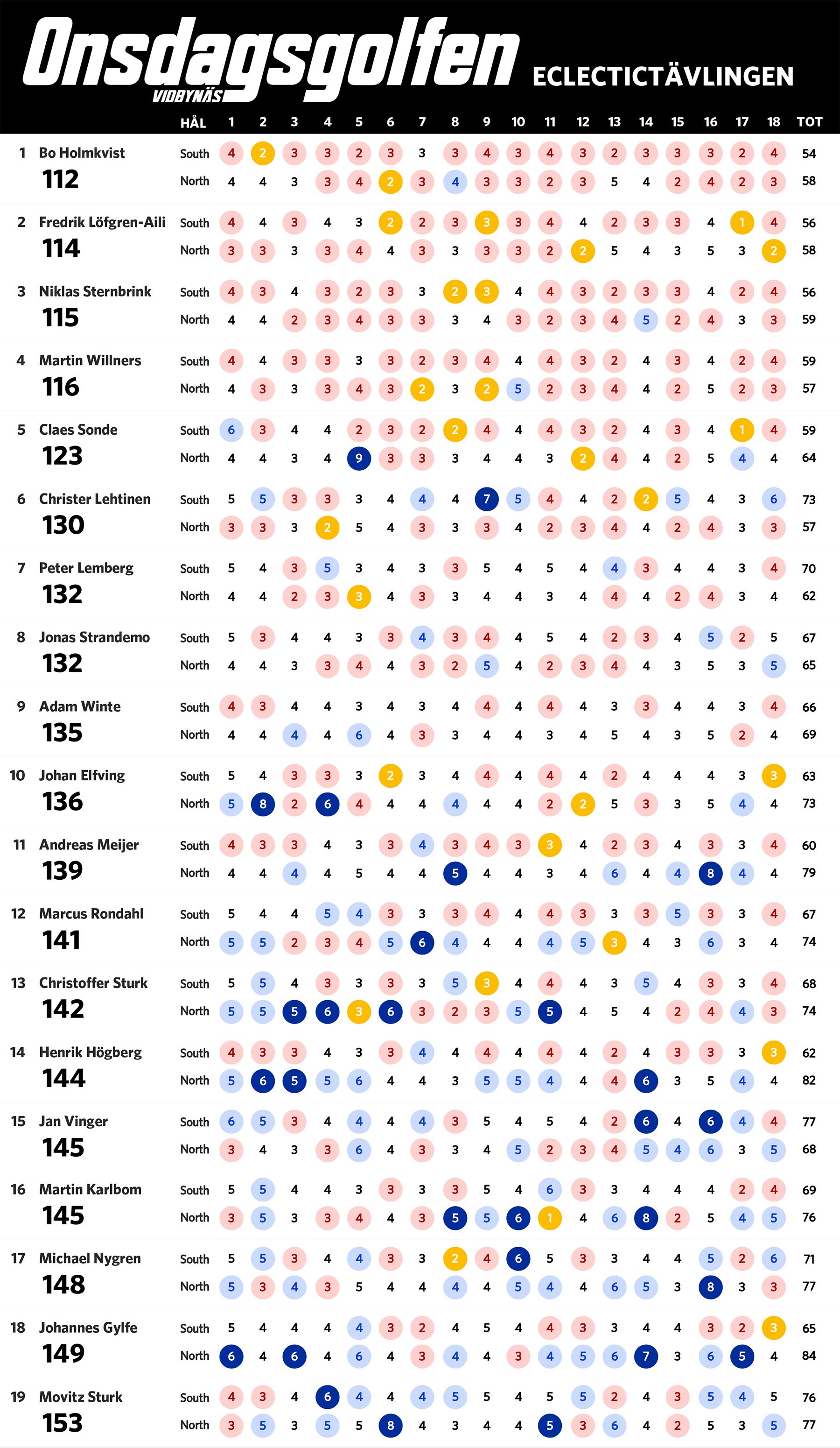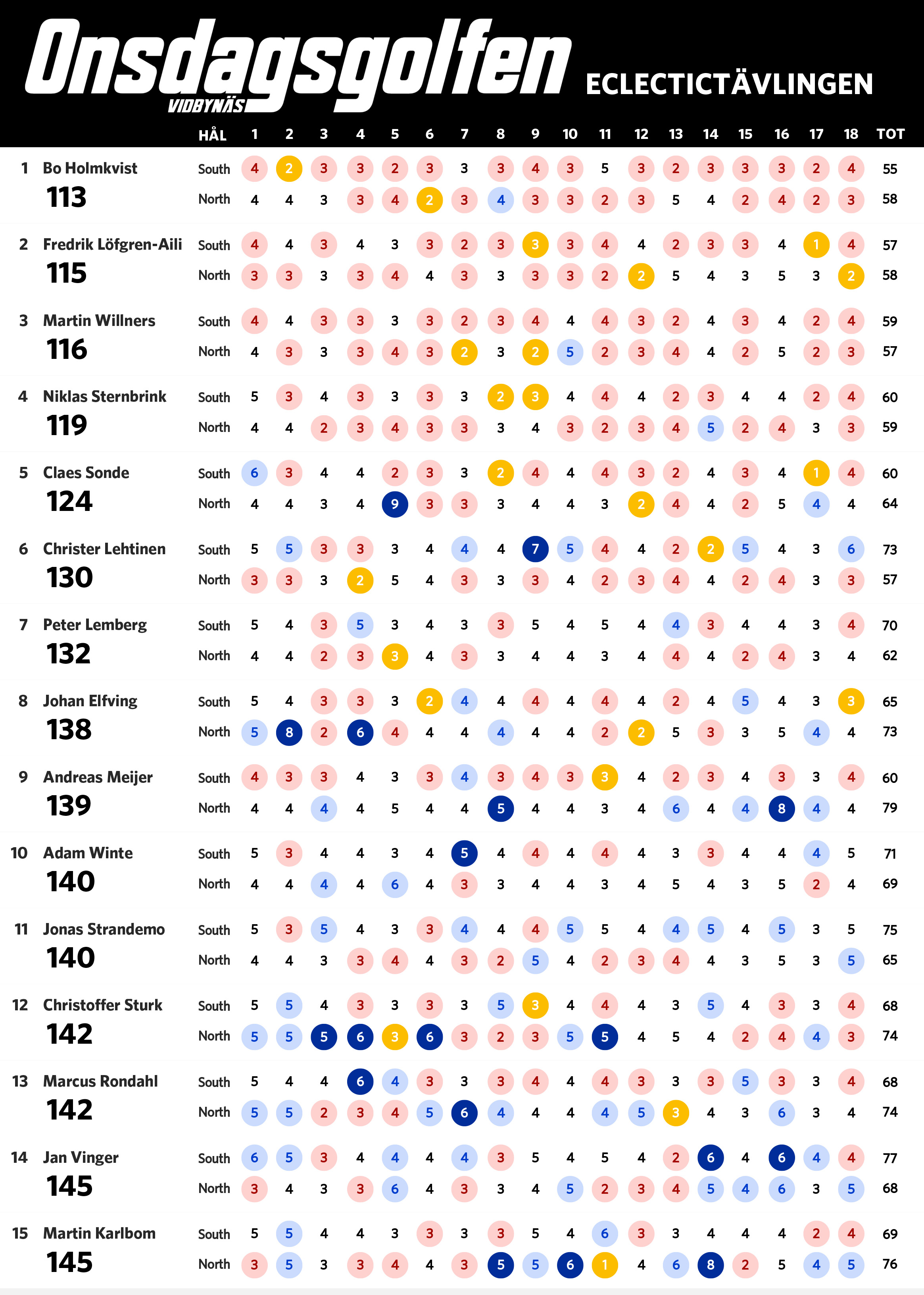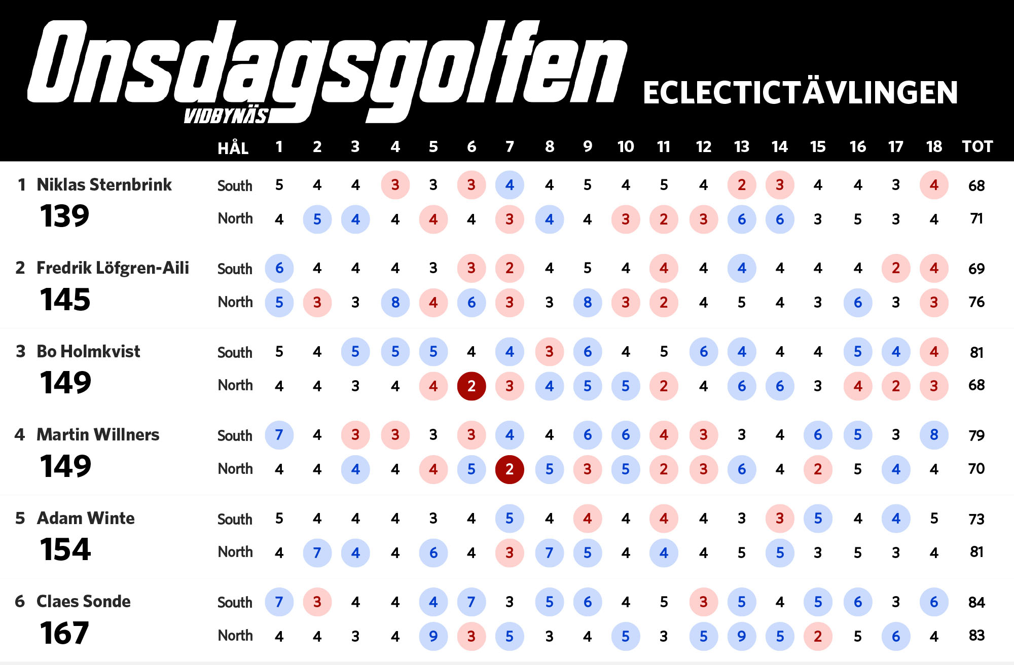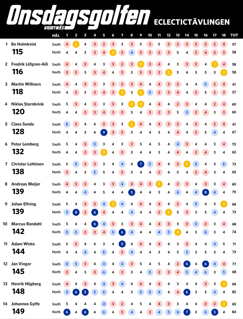 Nu när vi har spelat sju omgångar är det dags för en uppdaterad ställning i eclectic-tävlingen. Bosse har nu tagit sig ner under 60 slag på South och leder tävlingen fem slag för Claes. Nedan ser ni ställning med alla som har spelat både South och North på Onsdagsgolfen i år. Alla röda siffror är nettobirdies, alla mörkröda är nettoeagles och alla blåa är sådant vi vill förbättra nästa runda.