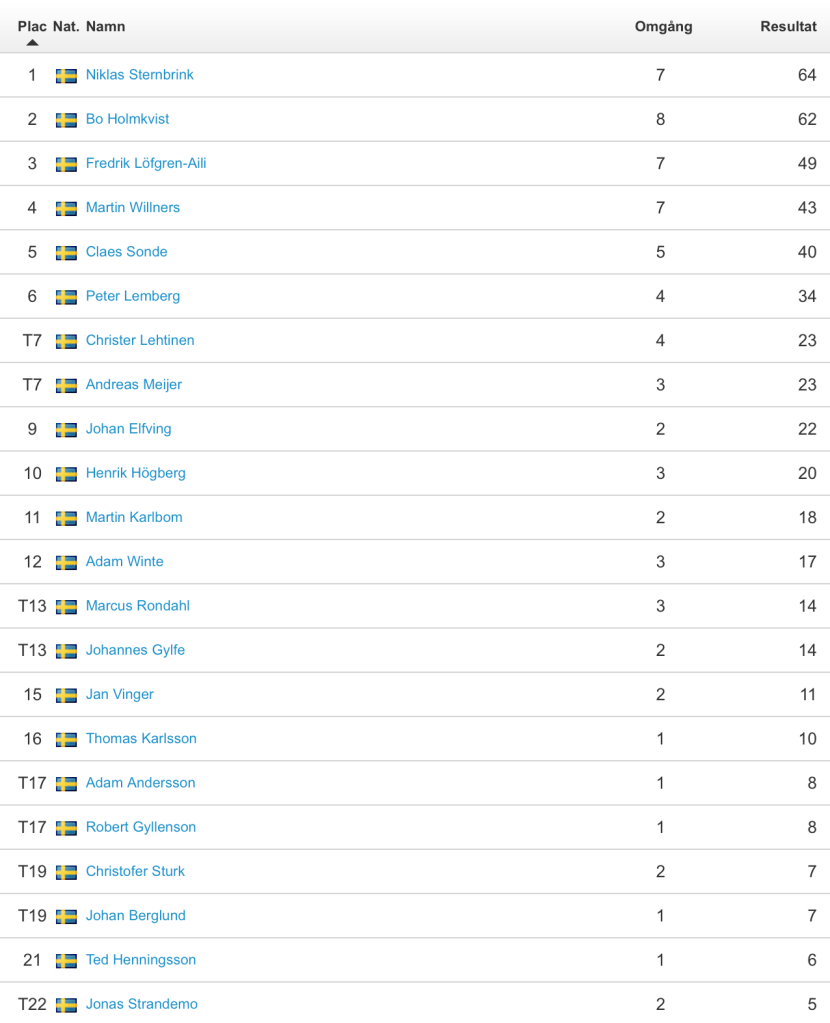 Niklas leder med bara två poäng före Claes och en poäng till före Jonas. När vinnaren kommer att utses så räknas de sex bästa resultaten + finalen in. Det är alltså långt ifrån avgjort, och de fem första har alla chansen att ta hem det. Det kommer att bli en mycket spännande final som spelas på South söndag 18 augusti med första start klockan 8.00.