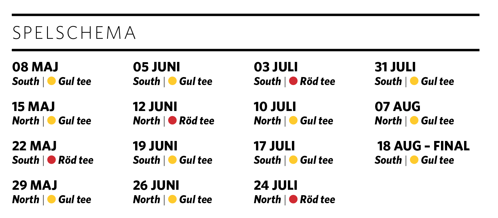 BANA & TEE Varannan vecka South och varannan vecka North. Blandning av gul och röd tee, damer spelar valfri tee.