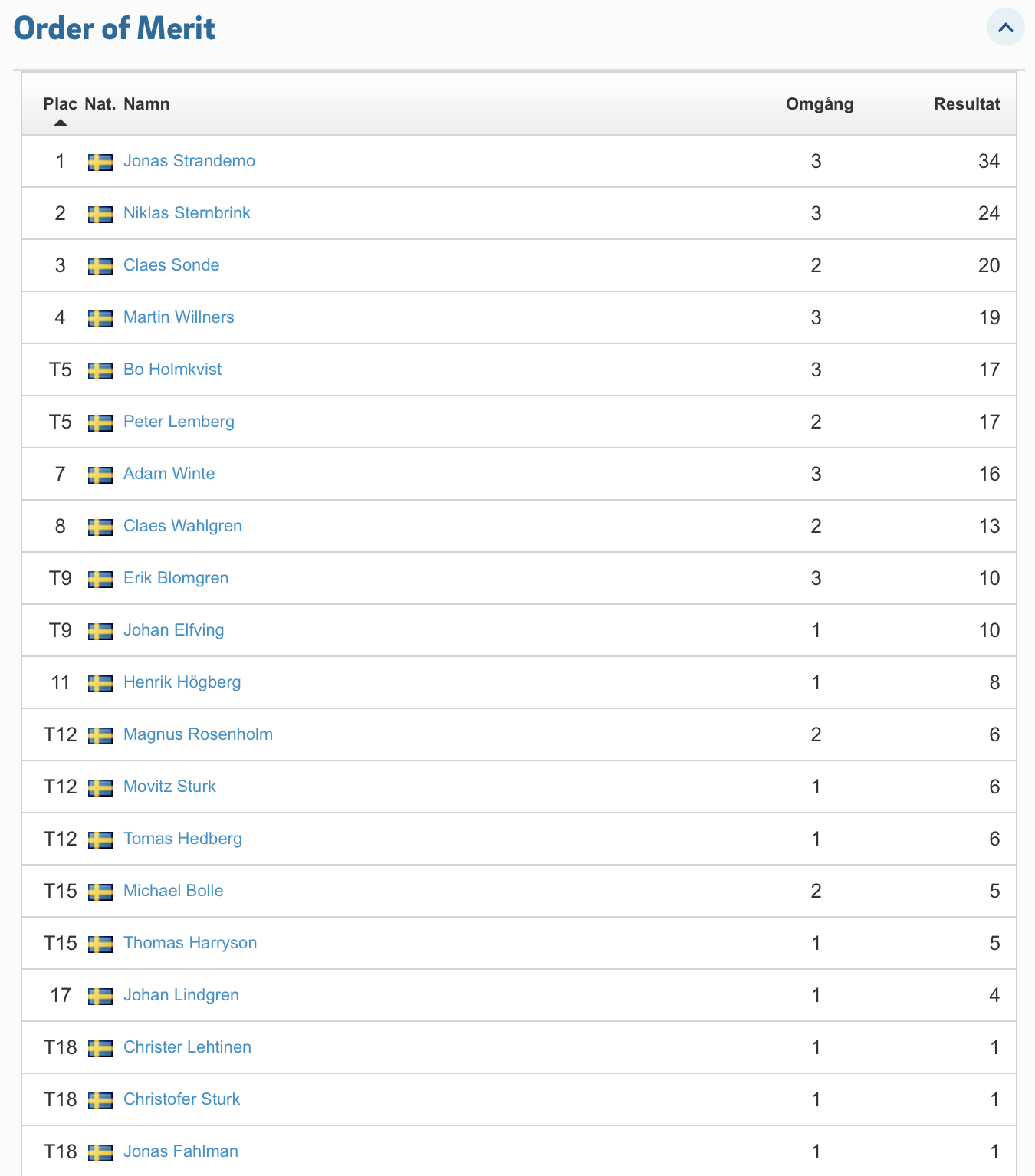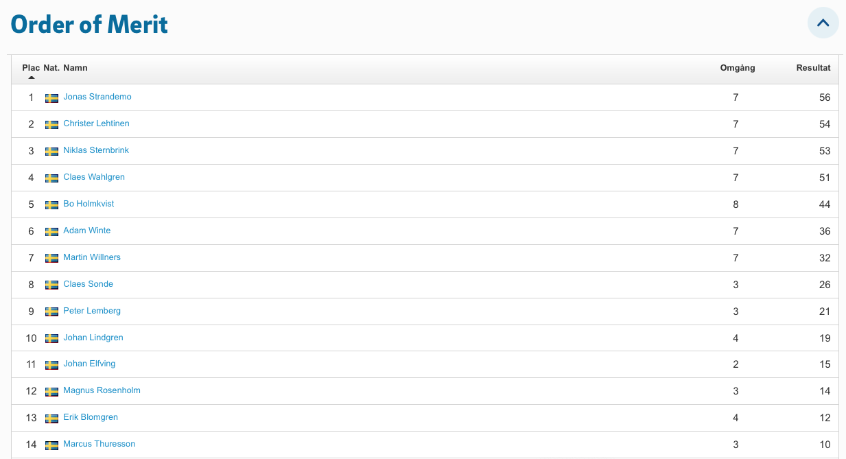 Jonas Strandemo har tagit täten i Order Of Merit genom två segrar och en andraplats, så han kan nu känna sig jagad av alla oss andra. Tvåa är fjolårets vinnare Niklas Sternbrink med tre stabila tävlingar med resultaten 4:a, 4:a och 2:a. Så här ser Order Of Merit ut just nu, men det är många omgångar kvar att spela , och eftersom vi i år bara räknar de sex bästa resultaten + finalen, så kan allt hända.