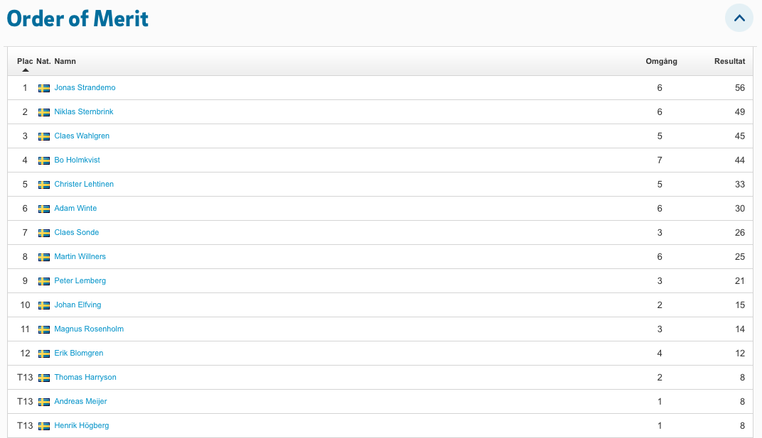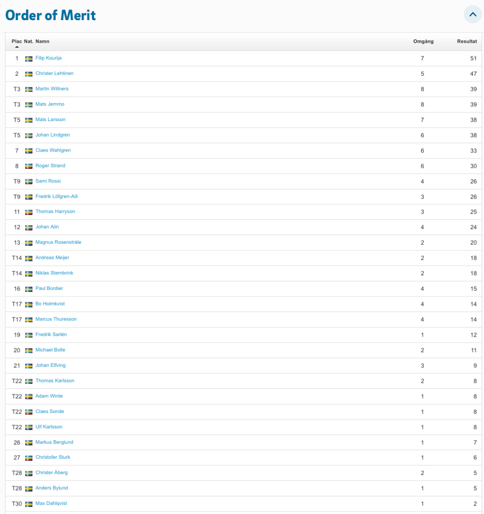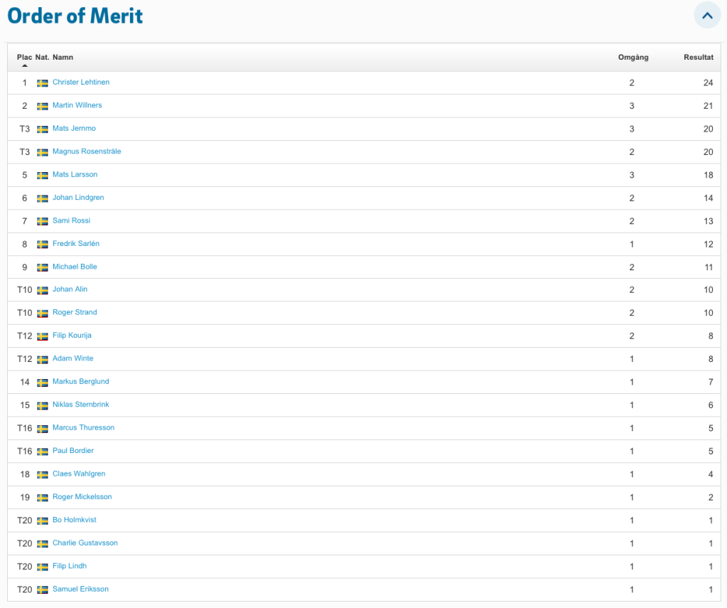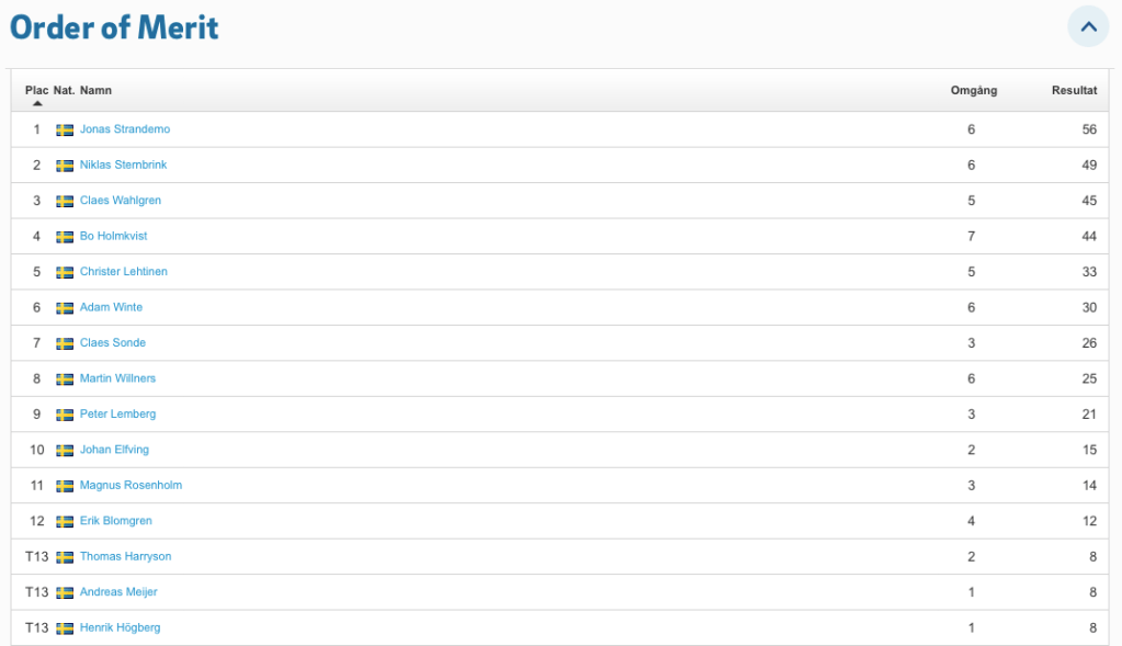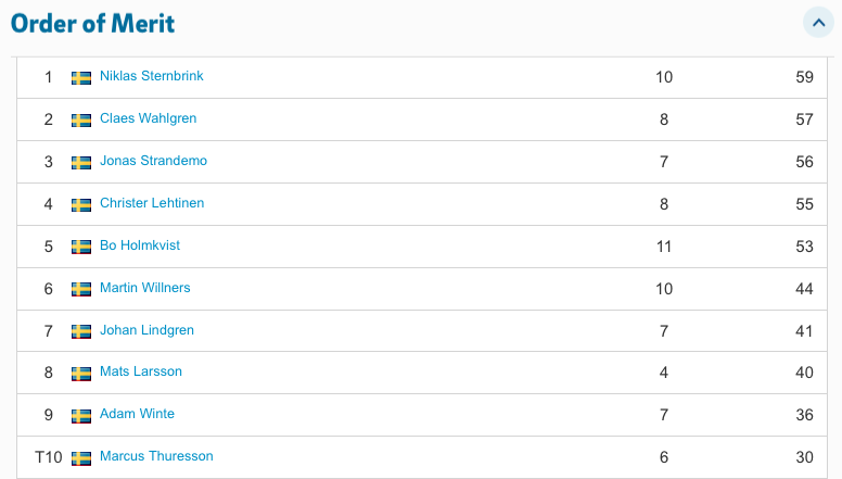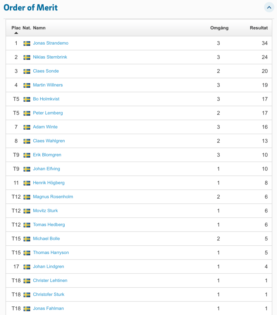 Nu har vi spelat hälften av årets tävlingar i Onsdagsgolfen. Leder i halvtid gör Niklas Sternbrink, två poäng för Bo Holmkvist och Fredrik Löfgren-Aili på tredje plats. Aktuell ställning hittar ni på Min Golf när ni ska anmäla er till en deltävling. Scrolla till slutet, där hittar ni Order of merit. I år är det de åtta bästa resultaten + finalen som räknas in till totalen. Vinst ger 12 poäng, en andraplats tio poäng, trea 8 poäng och sedan 7, 6, 5, 4, 3, 2 och 1 poäng till alla som är med i en deltävling. Här är en skärmdump på ställningen just nu.