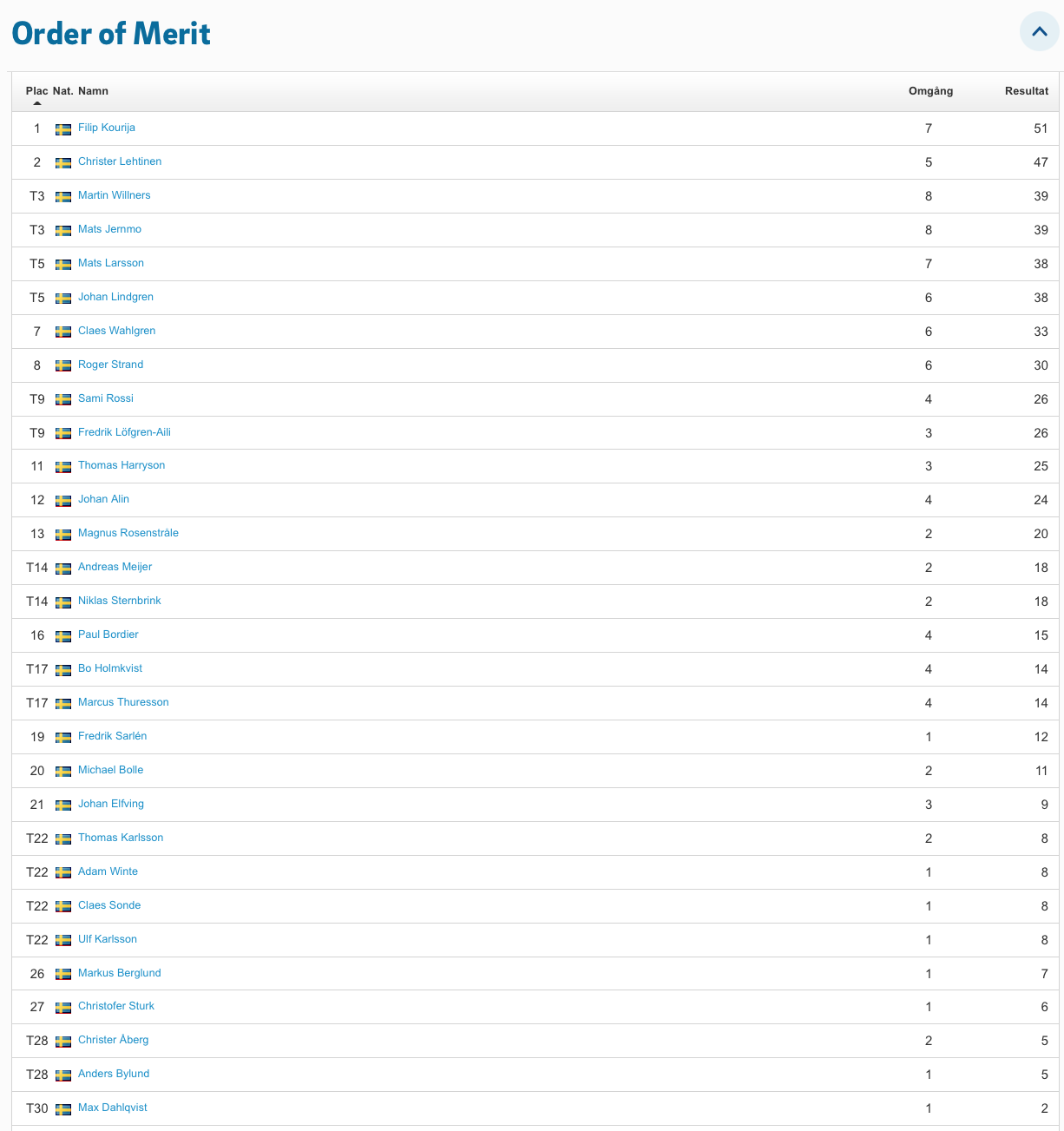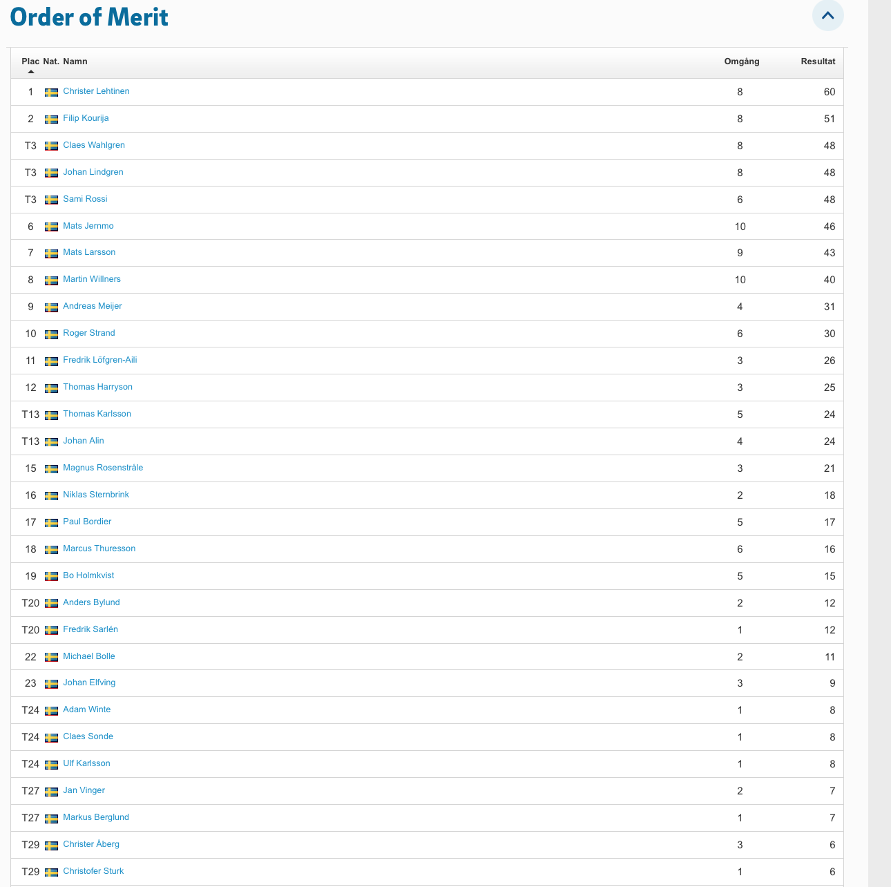 Hittills i år har vi varit 37 olika spelare, vilket är jättekul. Med tre omgångar kvar har vi följande Order Of Merit.